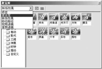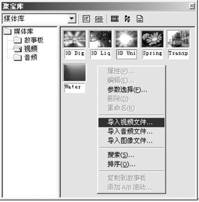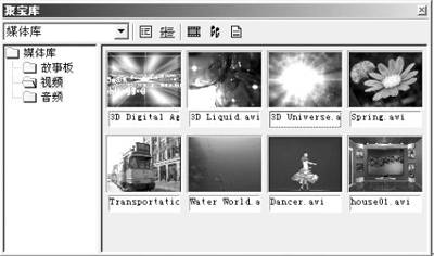 2.接下来我们需要导入视频素材。单击“聚宝库”窗口的列表框,从下拉列表中选择“媒体库”选项。