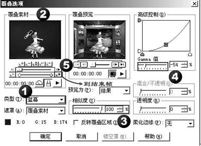 7.在时间轴上选择人物素材,右击鼠标,在快捷菜单中选择“覆叠选项”。在覆叠选项窗口中,按照下面操作进行:(1)选择类型为“蓝幕”。(2)将鼠标移到覆叠素材窗口中即变成一个吸管,点取背景的蓝颜色。(3)相似度设成100%。(4)Gamma值设成-54%。(5)以上是设置初始帧,还要设置结束帧。按下“到结束帧”,然后把相似度、Gamma值设成与初始帧的相同。