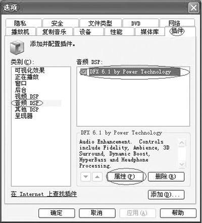 1.安装好DFX插件,然后打开WMP9,在“工具”菜单的“插件”中可看到已选中了DFX插件(图1)。打开“选项”选择“插件”标签,再选择“音频DSP”,打开DFX属性(图2)。