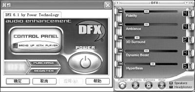 2.在属性窗口中我们可以看到两个主要按钮,“Power”和“Control Panel”,单击“Power”绿色为打开,红色为关闭,再单击“Control Panel”打开控制面板,这时我们就看到了它的主要调节选项(图3),它们分别为保真度、周围环境、3D环绕、动态增强、低音增强。我们可以根据自己喜好来调节它们,如果你不太懂怎么调,不要紧,DFX已预置了多种模式供大家选择,单击下面的P(Presets)按扭,DFX已为我们提供了39种音频模式,怎么样,够多吧?
