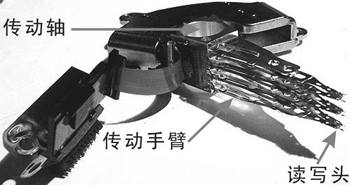 在硬盘中,通常每张碟片的每一侧都有一个读写头,这些读写头被同一个运动装置联系在一起,组成一组,因此它们是同时在盘片上移动的(图2)。