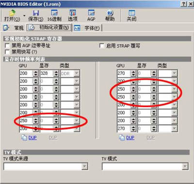 可以看到在D9f0H开始的那一行的几组十六进制数值,分别对应着NVIDIA BIOS Editor中的显卡核心及显存频率。
