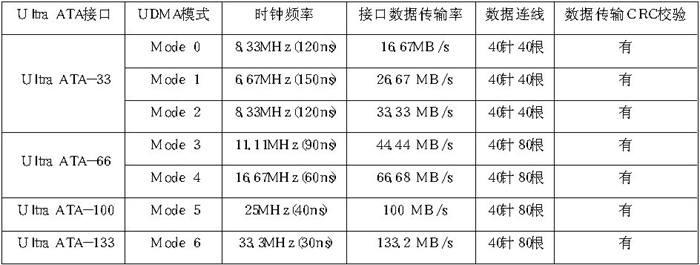 EIDE的标准也已经由过去的ATA、ATA-2、ATA-3发展到今天的Ultra ATA。Ultra ATA(也叫Ultra DMA)是由Intel和Quantum公司共同提出的硬盘接口标准,Ultra ATA的外部数据传输率经过多次革新,目前已经提高到了133MB/s。有一点要注意的是从Ultra DMA66标准开始,IDE硬盘线必须使用新式的80芯的线。下表是Ultra ATA标准所支持的各种传输模式的规格(其中最大外部传输速率为理论值):