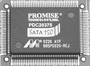 这是老牌I/O控制芯片厂商Promise设计的SATA150芯片,支持2个SATA150接口和1个ATA133接口,20375和20376的区别是20376还支持RAID0/1。通过集成Promise的这两款芯片来实现对串行ATA支持的主板也不少,另外也有不少PCI接口的串行ATA卡使用这两款芯片。