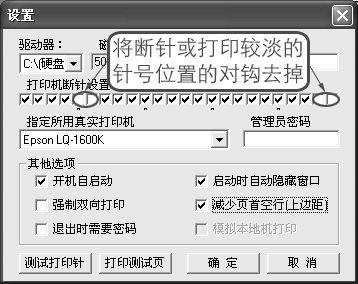 2.为了提高打印精度,建议大家尽量用滚轮送纸方式。“测试打印针”页中打印较浅的针最好也设置为断针;尽量设置连续的好针进行打印;如果测试页效果差系打印机走纸精度差,不要设置成双向打印,也可尝试调整打印针。