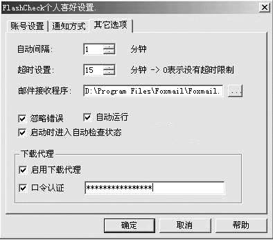 单击“确定”,切换到“通知方式”页,这里有两种方式给你选择。默认是选择“弹出窗口”通知方式,最好按照默认设置不要改动,再切换到“其他选项”页,尽量把“自动间隔”设成最小值如“1”,把“超时设置”的值设长一些如“15”(设为“0”时表示连接邮箱没有超时限制),在“邮件接收程序”处指定收发邮件运行程序的路径。这个程序指的是能够接收邮箱中的邮件的,如果程序中还没有这个邮箱账号,就新建一个。接下来把剩下的选项全部选上(图2),在“口令”处输入一个安全的口令(防止别人利用你设定的邮箱来遥控“受控机”下载),按“确定”退出“个人喜好设置”框。