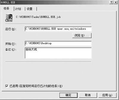 如果你打算只下载一个程序的话,可以预先在“受控机”中把FlashGet“工具”菜单下的“完成后关机”打上钩,这样FlashGet完成下载任务后就会自动关机。如果你要下载多个任务,可以尝试用“计划任务”来实现。启动计划任务,双击“添加已计划的任务”图标,单击“下一步”,在列表中随便选一个程序,单击下一步,选择“只运行一次”,按“下一步”,设定一个关机时间,单击“下一步”,把“当单击完成打开该任务的高级属性”复选项选上,单击“完成”。把“运行”文本框中的内容全部清空,输入“C:\Windows\rundll.exe user.exe,exitwindows”(图3),单击“确定”,当系统时间达到你设置的关机时间,无论FlashGet的下载任务是否已经完成,都会自动关闭计算机,还没有下载完的任务可以继点续传。这种方法在Win98/Me中调试通过,其他系统可以借用第三方软件来实现。