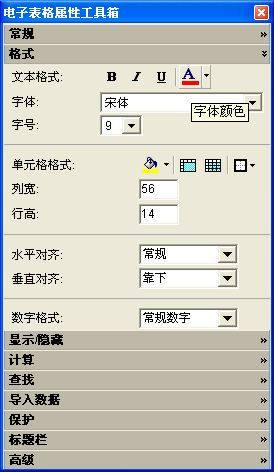 3.点击Excel插件中的属性工具箱。出现如图2所示的菜单。可以利用该菜单中“格式”选项编辑出你需要的表格样式。注意应该定义每个栏目的“数字格式”。