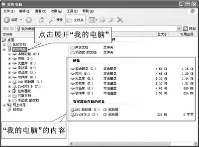 那么怎样查看文件夹和文件呢?好,试试吧,让我们点击“开始→所有程序→附件→Windows资源管理器”启动Windows资源管理器,然后在左边的“文件夹”窗口中单击“我的电脑”就可以展开“我的电脑”中的内容(图2)。
