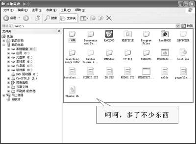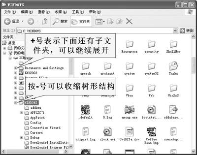 主要包括电脑中的磁盘,再点击C盘,就可以在其下看到C盘根目录下的内容(图3),主要是一些文件夹啦。这里要提醒大家注意,只要图标前面还有“+”的,说明文件夹下还有子文件夹,可以继续展开,不信点一下Windows文件夹试试(图4)。