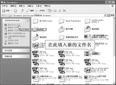 在Windows XP下修改文件名的方法很多,先选定要修改的文件(图6),然后在左边的“文件和文件夹任务”栏中点击“重命名这个文件”,或者单击右键,在右键菜单中选择“重命名”命令,还有就是直接按键盘上的F2键,此时文件名处会出现一个文字框,在文字框中填入新文件名就行了,如果文件名中有扩展名可不要连扩展名一起改了,一定要保留原有的扩展名。