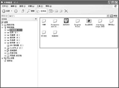 通过“我的电脑”也可以查看磁盘中的文件夹和文件。方法和资源管理器差不多,要在左边窗格中显示树形目录,可以按下工具栏中的“文件夹”按钮,这时“我的电脑”窗口与资源管理器完全是一样。