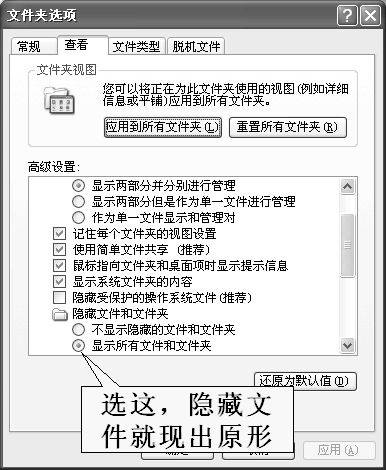 “查看”选项卡,在“高级设置”栏中找到“隐藏文件或文件夹”,选择“显示所有文件和文件夹”就可以将隐藏文件显示出来了(图10)。这里设置相当多,比较常用的还有隐藏已知文件扩展名、隐藏受保护的操作系统文件等设置,不妨多试试。要是改得连你自己也找不着北啦,选择“还原为默认值”就可以恢复初始的状况了。