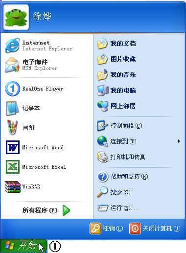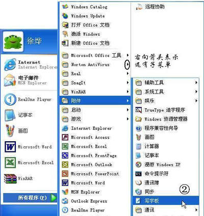 这里我们先认识一个特别的“大”菜单──“开始”菜单。我们在Windows XP中要做的工作都可以从这个菜单“开始”。比如要打开“写字板”就可从“开始”菜单打开,其步骤如下: