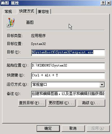 我在写稿时,随时用Print Screen键抓屏,再用“画图”程序进行整理保存。因此,常常需要从“开始”菜单启动“画图”程序,比较麻烦。于是,我就给画图程序设置了一个快捷启动键:从“开始→程序→附件”菜单中找到“画图”程序,右击鼠标,在随后弹出的快捷菜单中,选“属性”选项打开“画图属性”对话框(如图),切换到“快捷方式”标签下,将鼠标定位到其中“快捷键”选项后面的方框中,输入一个字母(如“T”等,此时,该方框内填入了“Ctrl+Alt+T”组合键),确定返回。以后需要启动“画图”程序时,只要按下“Ctrl+Alt+T”组合键就OK了,是不是很方便!