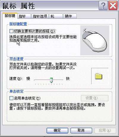 如果刚刚开始学习电脑,双击鼠标的速度不会很快,因此要调整双击速度,才能以较慢的双击速度打开文件夹。在“控制面板”中,选择“鼠标”,双击打开它(图1)。在弹出的“鼠标 属性”设置窗口里,选择“鼠标键”项,单击打开它。在其中的“双击速度”选项中,有一个调节双击速度的标尺,你可以根据自己的实际速度进行调整,调整后还可以双击右边的文件夹图标以测试你的速度。