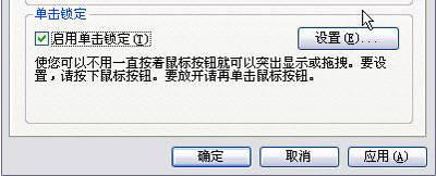 这样如果你再拖动图标、文件夹和窗口时,只要单击一下,然后放开鼠标左键,直接拖动就可以了。需要放下时,单击一下鼠标即可,是不是很方便!另外你还可以设置按下鼠标多久单击才能锁定,具体设置方法是:单击右边的“设置”按钮,然后在弹出的窗口中,根据需要移动标尺上的滑块。如果你设置的时间太长,那么你就需要等很长时间了。
