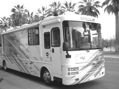 展会外最吸引人的莫过于带有Intel标志的豪华大巴了(图1)。乘客坐在这辆大巴上,可以通过802.11a/b协议无线卫星上网(真够先进的,媒体记者可以把它当做是一个大型的移动新闻发布室了)。