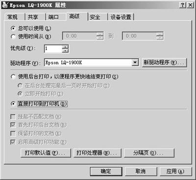 3.单击“高级”标签卡,选中“直接打印到打印机”单选框,如图1所示。
