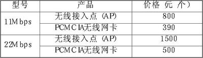 考虑到预算和性能,笔者决定采用国内的无线LAN产品。目前市场上主流的还是基于802.11b的无线产品,虽说传输带宽只能达到11Mbps,但满足日常办公还是足够了,何况并不是全部机器都采用无线上网。在市场上采购无线产品时发现,市面上已经出现了22Mbps的新品,售价也不是很贵(如表)。于是笔者购买了顶星公司生产的22Mbps的无线接入点(AP)两个(TE-WA200),笔记本用PCMCIA无线网卡4块(TE-WP200),总体花费5000元,比破坏装修重新布线的花费要便宜许多,也比走明线美观。