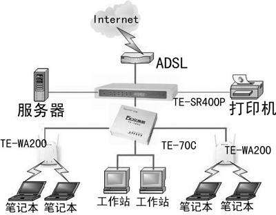 1.组建主干网,主干采用TE-SR400P路由共享器,通过ADSL Modem接入互联网,同时打印机直接连在TE-SR400P上,实现打印共享,下行连接TE-70C。