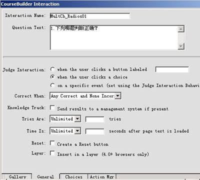 三、在“CourseBuilder Interaction”操作界面“General”标签下(图1)的“Category”中选择“Multiple Choice”(多项选择)的“类型2”,在图2的“Question Text”中输入“1.下列哪题判断正确?”在“Judge Interaction”(交互判断)中选择“when the user clicks a choice”(用户点选),其余选项默认。