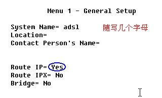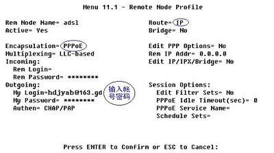 把光标移到第三行“Encapsulation”,按空格键选择“PPPoE”再把光标直接移到“My login”项,在等号后输入宽带上网账号,“My Password”自然是输入密码了。再把光标移到“Route=”处,按空格改成“IP”,一路回车回到主界面。