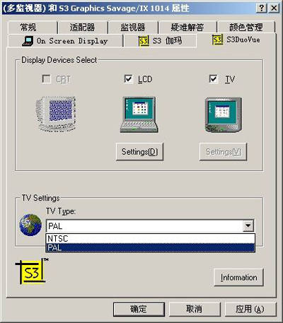 用S端子线连接T21和电视机后,开启T21的电源,在“显示属性”的“设置”标签中单击“高级”按钮,再选择“S3DuoVue”标签,在右侧“TV”前的框内打上“√”(注意:如果笔记本电脑与电视机之间没有用视频线连接,该复选框及下方的电视机图标都呈灰色,即处于不可用状态),然后在标签下方“TV Settings”选项中的“TV Type”里选择相应的电视制式(图2,一般情况下选“PAL”即可,系统默认的是“NTSC”,如果电视机支持“NTSC”和“PAL”的自动转换,任选一个均可),之后单击“确定”。
