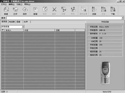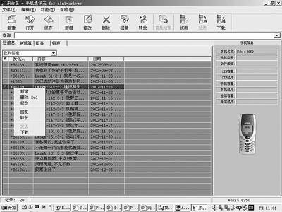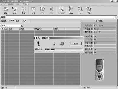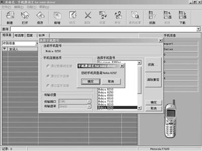 界面上已经出现了诺基亚8250的图片(图2),上面的表格显示此手机里存储的信息。这表明已经与手机联系上了,下一步就是要传递信息了。