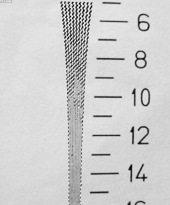 由于拍摄的相片过于精细,通过肉眼来分辨难免有些偏差,为保证数据的精确,我们在Photoshop中用魔术棒来划分图中曲线之间的临界点,见图8,经过我们多次变焦拍摄取平均值,得到的测试数据如下: