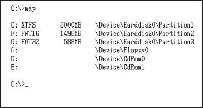 创建好以后,按Esc键退出diskpart命令。那么如何确认刚才的分区操作呢?我们可以采用MAP命令解决。在C:\>提示符后面输入map,就可以看到前面的操作结果了(图4)。