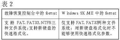 故障恢复控制台中格式化的命令还是format,但这个format命令有了很大的变化,它可以直接把目标分区格式化为FAT、FAT32、NTFS三种文件系统中的任何一种,只要在后面加上相应的参数即可,而且还支持新硬盘的快速格式化。表2把新、老format命令作了一个对比:
