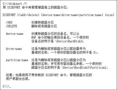 3.故障恢复控制台支持帮助查询,可以使用命令后加“/?”的方式查询帮助。例如diskpart命令的帮助为:(图7)。