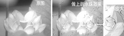 “清水出芙蓉”这是荷花最美的姿态,这时荷花上的水珠更漂亮。在我们的后期图片处理中,我们也可以给荷花加上逼真的水珠效果(图1)。这是做出来的吗?当然,这就是Photshop的神奇所在。下面我们就来看是如何实现的吧。