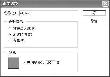 2.双击新建的“Alpha”通道,在弹出的通道选项中的色彩指示选择“所选区域”,颜色的不透明度设为“100”(图3)。