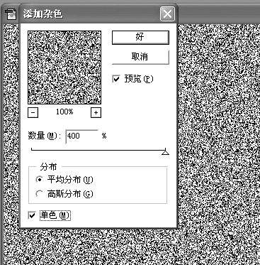 3.点“滤镜→杂色→添加杂色”,在弹出的对话框中设置数量为“400”,分布为“平均分布”,勾选“单色”(图4)。