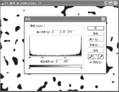 5.再次点“滤镜→模糊→高斯模糊”,在弹出的对话框中设置半径像素为“2”,将“Alpha 1”通道进行第2次模糊处理。然后选择“图像→调整→色阶”在色阶的控制面板中的输入色阶3个方框中分别设置为“0、1.45、175”(图6)。