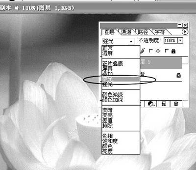 10.点“编辑→填充”,在填充面板的使用选项中选“50%的灰”,不透明度设为100%,其他的为默认选项。点“确定”结束。然后在层面板中的模式中选择“强光”模式。这样图层1的灰色在强光的模式下就显得很透明了(图8)。