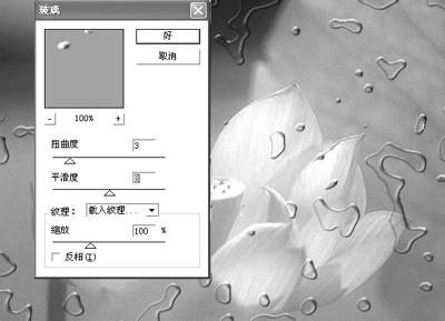 12.按键盘上的“Delete”键,将水珠以外的部分删除。然后点“选择→反相”只选择水珠。再点“滤镜→扭曲→玻璃…”在打开的玻璃的对话框中将扭曲度设为“3”,将平滑度设为“7”,从纹理中选“载入纹理…”然后在出现的对话窗口中载入我们刚才保存的“水珠.psd”文件。这样水珠就应用了玻璃效果(图10)。