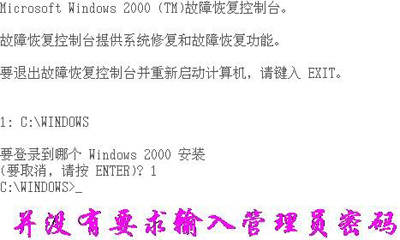 笔者重新启动了电脑,使用Windows 2000 Professional安装光盘引导,在Windows 2000安装选择界面选择修复Windows 2000(按R键),然后选择使用故障控制台修复(按C键),系统会扫描现有的Windows 2000/XP版本。由于笔者只有一个操作系统,所以只列出了一个登录选择(1:C:\Windows)。从键盘上按1,然后回车,这个时候,果然如国外所传,Windows XP并没有要求输入管理员密码,而是直接登录进入了故障恢复控制台模式(如果使用的是Windows XP安装光盘启动的,那是要求输入管理员密码的。这里指的管理员是指系统内建的Administrator账户)(如图)。熟悉Windows的朋友都知道,故障恢复控制台里面可以进行任何系统级别的操作,例如:复制、移动、删除文件,启动、停止服务,甚至格式化、重新分区等破坏性操作。