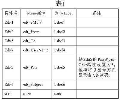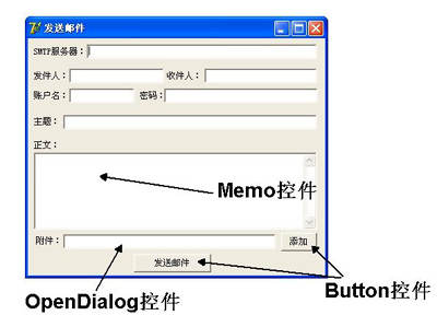 添加8个Label控件(图2);添加7个Edit控件(图3),属性设置参考表1;添加一个Memo控件(图4),属性设置参考表2;添加两个Button控件(图5);添加一个OpenDialog控件(在Dialogs面板中,如图6),用于浏览附件。