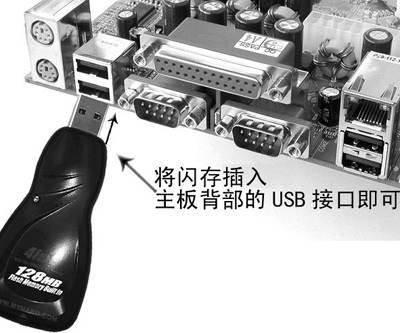 目前的闪存绝大多数采用USB接口,使用时只要插到计算机的USB接口里面即可(图4),无须打开机箱或者使用附加连线,外接电源更是多余。这点比起需要驱动器才能够使用的其他存储器有着不可比拟的优势。