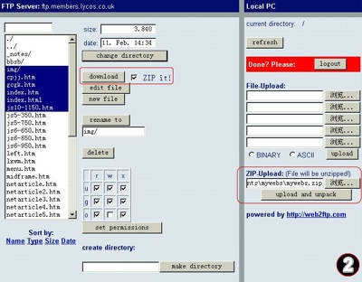 Web2ftp不仅可以绕过被屏蔽的IP地址来访问FTP服务器,还提供了上传压缩文件释放的功能,可以达到快速上传主页的目的。例如你的本地站点为:C:\Mywebs,进入该文件夹后,选取该文件夹中的所有文件和子文件夹,然后用Winzip压缩(包括路径)成一个文件mywebs.zip,再用Web2ftp上传(需将当前文件夹设置成根文件夹),它将自动将压缩包的文件解压缩到相应的服务器上对应文件夹下。
