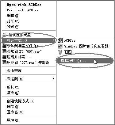 找到要修改的文件,右键单击文件,然后单击“打开方式”(如果没有“打开方式”,则单击“打开”)下面的“选择程序”(图1),然后在“打开方式”对话框的程序列表中找到要使用的程序(图2),Windows会好心地为你推荐一个,如果不满意就在“其他程序”中找,要是还没有就点“浏览”按钮,定位到程序所在的位置选定该程序就行了,方法和查找文件的方法是一样的。按“确定”之前要注意选中下面的“始终使用该程序打开这些文件”复选框。