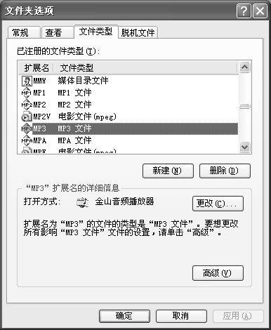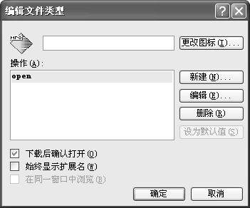 打开文件夹选项的操作步骤还记得吧(按“开始→控制面板→主题和外观→文件夹选项”或在任意文件夹窗口中选择“工具→文件夹选项”),打开后选择“文件类型”选项卡,从“已注册的文件类型”列表中选择要更改的文件类型(图3),如MP3,然后单击下面的“高级”按钮,会弹出“编辑文件类型”对话框(图4)。