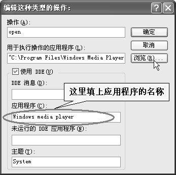 你可在“编辑文件类型”对话框中(图4)选择“编辑”按钮,然后在弹出的“编辑这种类型的操作”对话框中选择“用于执行操作的应用程序”后的“浏览”按钮,找到想用来打开文件的程序(如将MP3用Windows Media Player来打开),并在下面“应用程序”栏中填上应用程序的名称,选择“确定”就完成了用于执行操作的应用程序的设置。