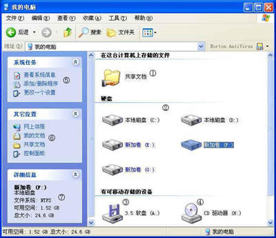 ①共享文档:让“网上邻居”也能看到的文件。②硬盘:能查看到硬盘上不同分区的文件。③软盘:在软驱中插入软盘后,双击盘符查看其中的内容。④光盘:在光驱中放入光盘后可自动播放上面的内容,或者双击盘符查看。⑤系统任务:查看系统配置,管理软硬件。比如,单击“查看系统信息”可以查看到电脑的CPU、内存等配置内容。⑥其他位置:快速链接到所希望的位置。⑦详细信息:显示选中设备的空间大小。