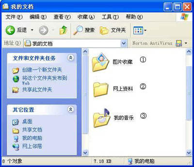 ①图片收藏:我的文档自带的文件夹,专门存放图片。②网上资料:我自己建立的文件夹。③我的音乐:我的文档自带的文件夹,专门存放歌曲。