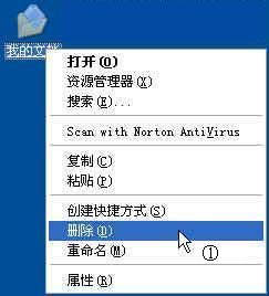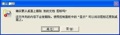 ①右击图标打开快捷菜单选择“删除”命令。②单击“是”按钮。