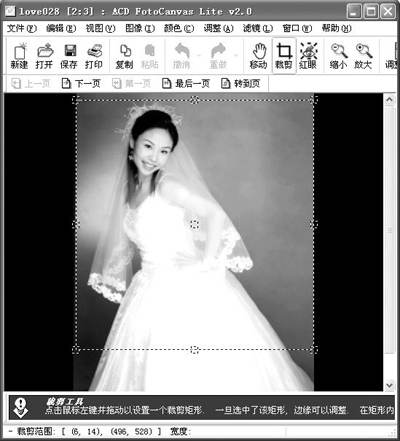 1.在ACDSee 5.0中点菜单“工具→在编辑器中打开…”打开图形编辑器,然后打开一幅你要调整的照片。点工具栏的“裁剪”按钮,然后在照片上拉取一个正方型的选区(图2)。然后在选区内双击鼠标左键。现在选区以外的部分就被剪切掉了。